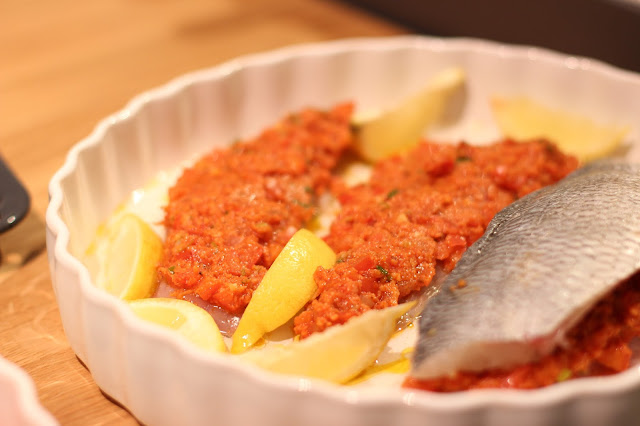- Den Fisch mit Olivenöl beträufeln und den Sugo darüber träufeln im Backofen bei 140° C 10 Minuten garen.