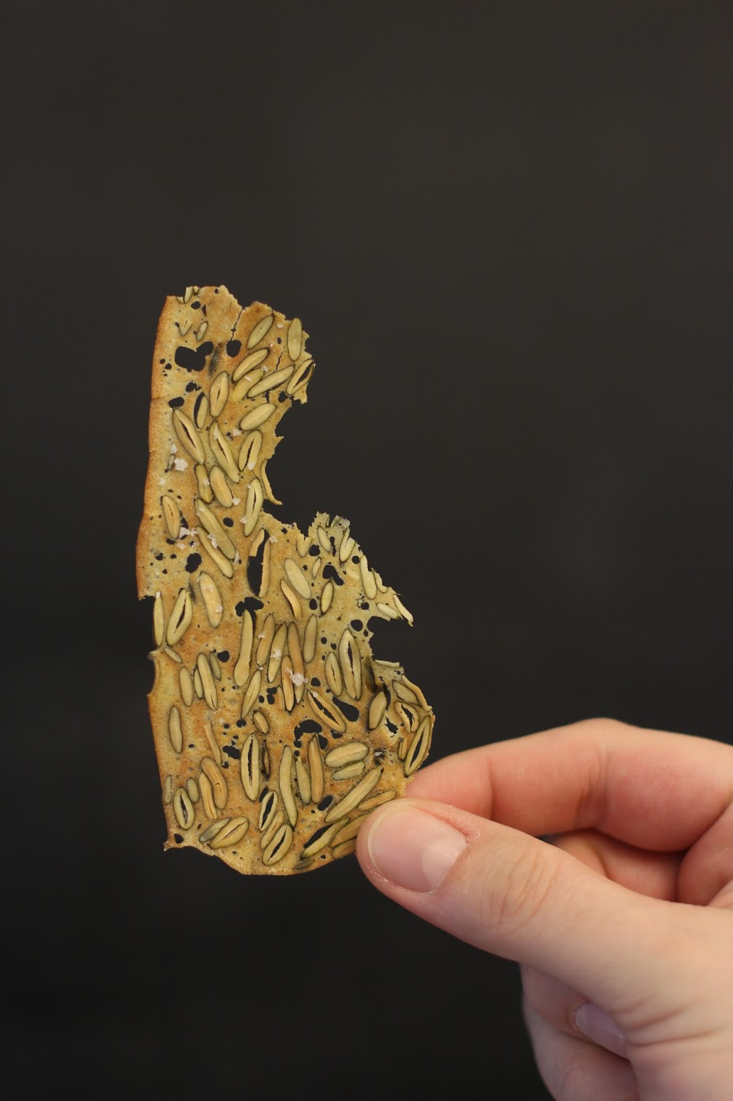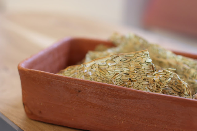 Und dann machte ich die Entdeckung des Tages. In einer Ecke stand eine Tonform mit hauchdünnem Knäckebrot mit Kürbiskernen. Ganz ehrlich, sowas (entschuldigt den Ausdruck) Geiles habe ich noch nie gesehen.