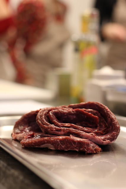 Gabriele Hussenether begrüßte uns und erzählte uns erst mal ein wenig über den Ablauf des Tages, 6 Stunden würden wir zusammen in der MoKo verbringen und dabei 4 verschiedene Fleischsorten zubereiten. Kronfleisch, Bürgermeisterstück, Nierenzapfen und Ochsenschwanz. Keine Angst, auch sie mache viele Fehler. Aber das sei ja das Schöne am Kochen, dass man sich einfach ausprobieren kann. Ausserdem verriet Sie uns noch, dass wir auch noch einen Nachtisch zaubern werden – ein cremiges Vanilleeis zu dem es dann einen Brownie und Orangenfilets geben sollte. Yummy – ich glaube uns allen lief das Wasser im Mund zusammen.